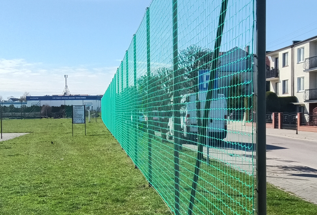 Zlecenia dotyczyło wymiany siatek na kilku piłkochwytach zlokalizowanych przy boisku gminnym. Najdłuższy odcinek o długości 104mb wypełniony został siatką polietylenową wyprodukowaną na specjalne zamówienie.